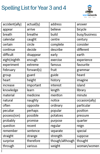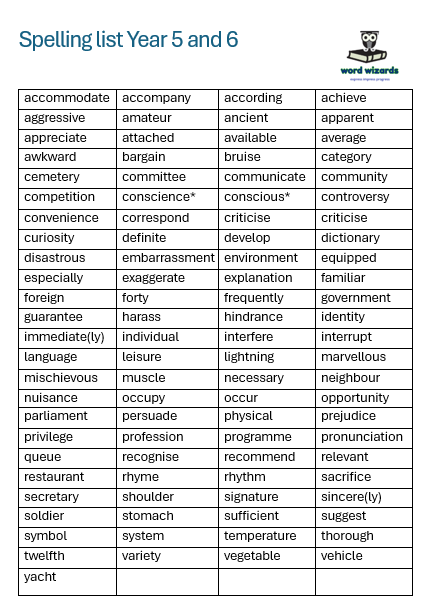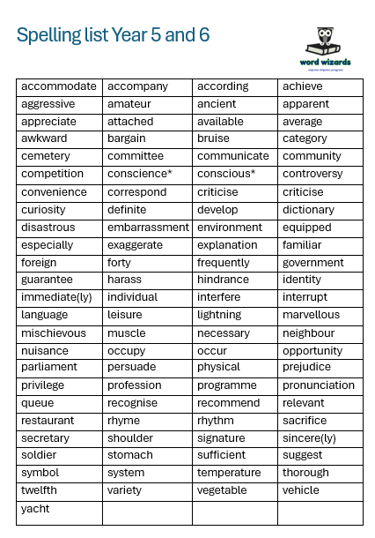 KS2 English Curriculum Spelling lists for Year 3, 4, 5 and 6